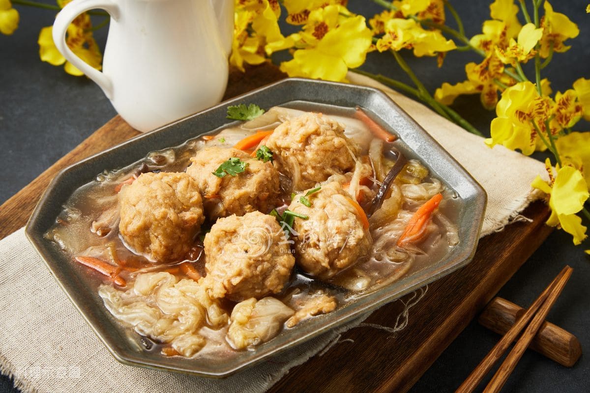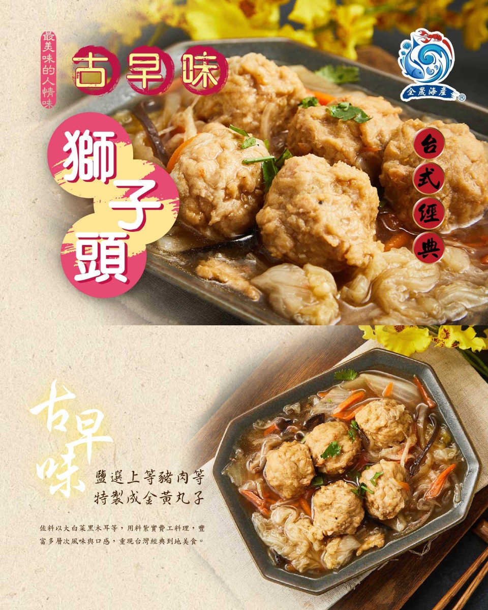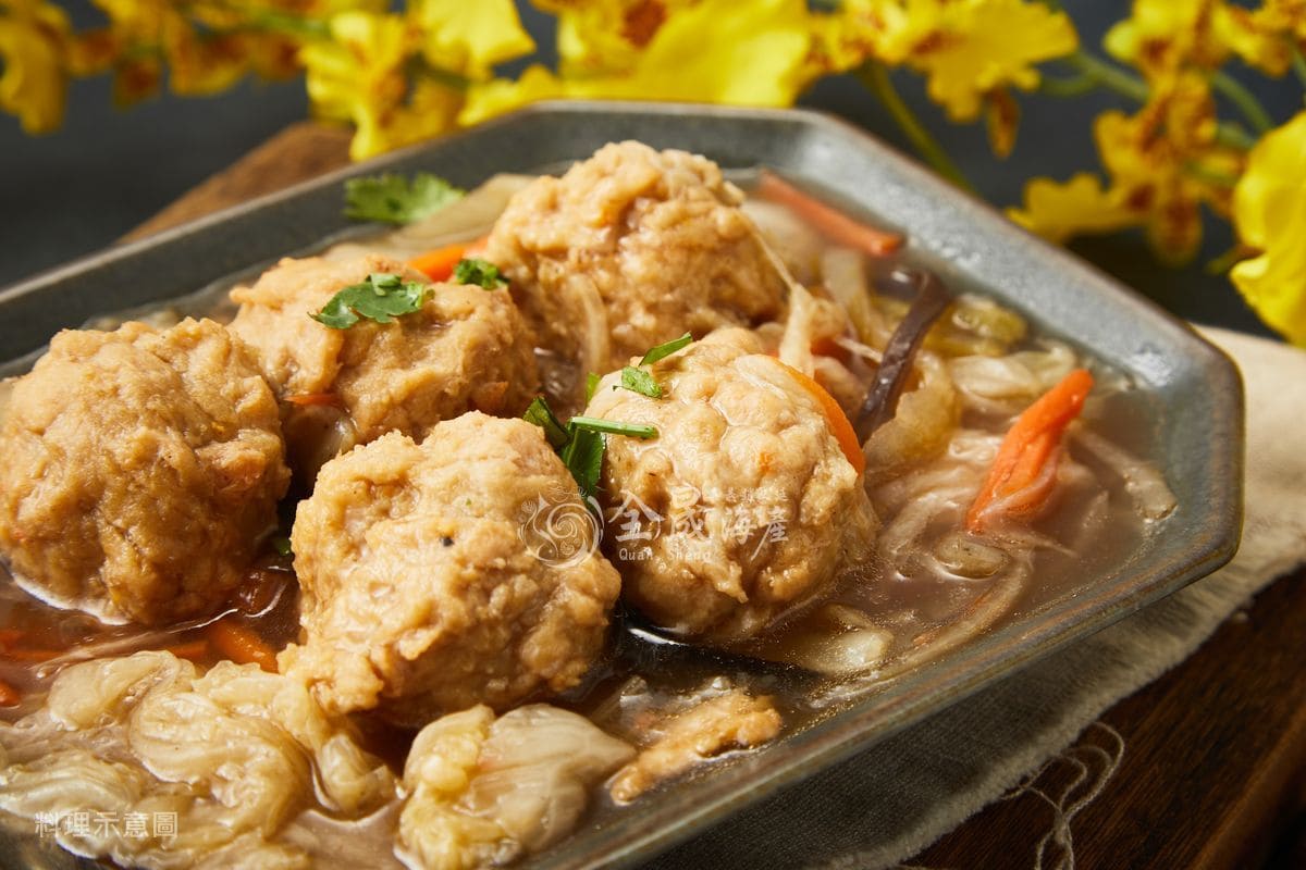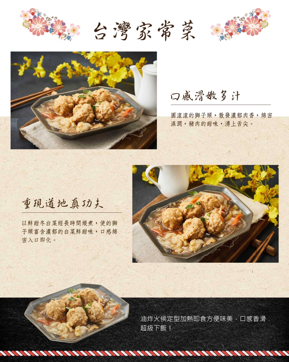 成分 : 水、大白菜、獅子頭(豬肉、大豆組織蛋白、玉米粉、蔥、薑、麻油、香料、L-麩酸鈉)、紅蘿蔔、洋蔥、粘稠劑(乙醯化己二酸二澱粉)、醬油、味醂(果糖、水、米、米麴)、蒜頭、蕃茄醬(蕃茄糊、鹽、糖、釀造醋)、香油、黑木耳、鹽、香菇、大豆沙拉油、蝦米、糖、通骨粉(豬骨抽出物、乳糖、酵母抽出物、香料、豬油)、健美鮮(胺基乙酸、5'-次黃嘌呤核苷磷酸二鈉、5'-鳥嘌呤核苷磷酸二鈉、乳糖、琥珀酸二鈉 )、L-天門冬酸鈉、白胡椒粉、五香粉(小茴香、八角、肉桂、丁香、胡荽、香芹)、八角粉