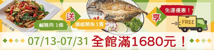 活動2. 消費商品金額滿 1680元再加送鹹豬肉一條、挪威鯖魚一尾(單筆訂單不累贈)